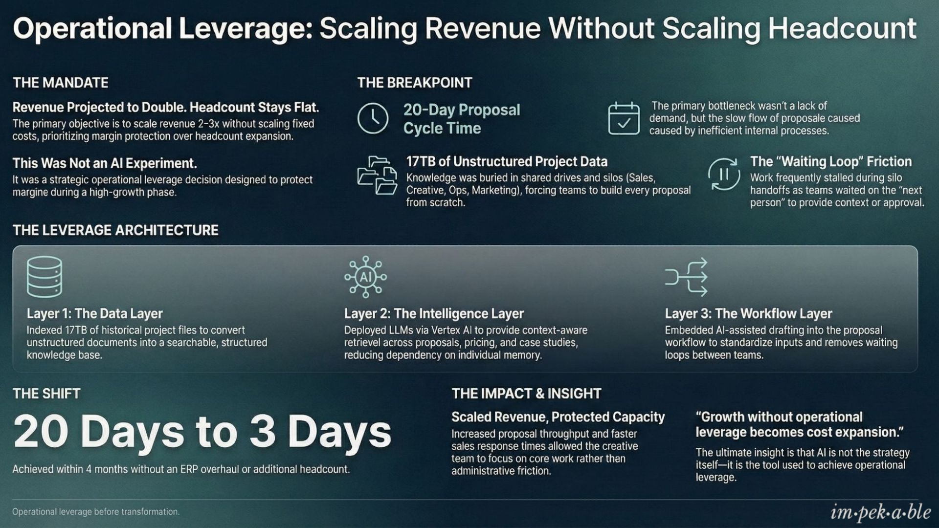 At Impekable, we help enterprises move from isolated AI pilots to deployed, integrated systems that drive real operational leverage.